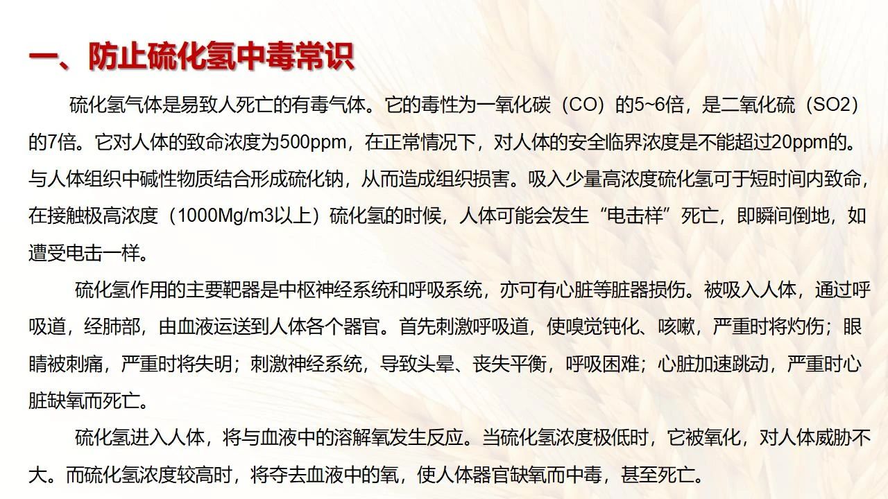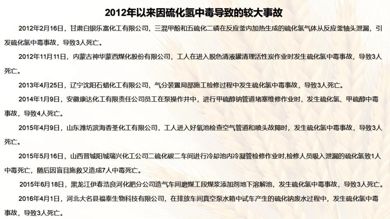 硫化氫中毒多由于含有硫化氫介質(zhì)的設(shè)備損壞,輸送含有硫化氫介質(zhì)的管道和閥門泄漏,違反操作規(guī)程、生產(chǎn)故障以及各種原因引起的硫化氫大量生成或逸出,含硫化氫的廢氣、廢液排放不當(dāng),無適當(dāng)個人防護(hù)情況下的密閉空間作業(yè),硫化氫中毒事故時盲目施救等所致。