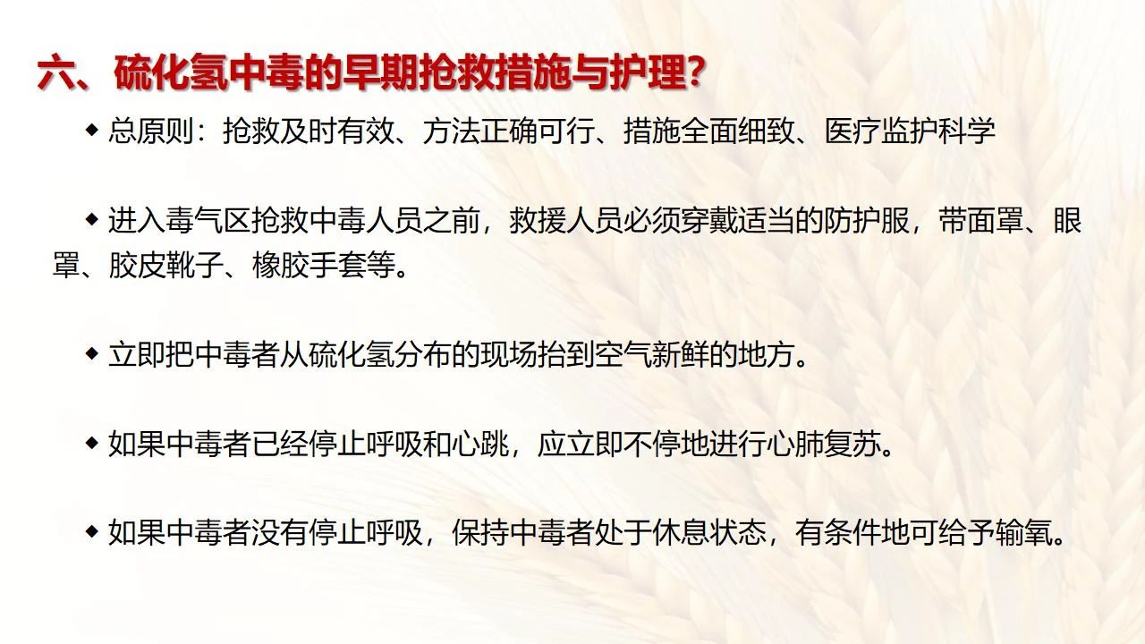 涉及硫化氫的裝置、設(shè)備設(shè)施應(yīng)制定硫化氫中毒專項應(yīng)急預(yù)案、現(xiàn)場處置方案,發(fā)生硫化氫中毒事故時,參與現(xiàn)場搶救者必須在做好安全防護(hù)保障情況下進(jìn)行施救。應(yīng)穿隔離衣、戴防毒用具(空呼等),切忌盲目施救,謹(jǐn)防自身中毒。應(yīng)快速將患者抬離中毒現(xiàn)場,移至空氣新鮮通風(fēng)良好處,解開衣服、褲帶等,吸入氧氣,及早使用糖皮質(zhì)激素,適當(dāng)使用解毒藥物,同時積極對癥處理搶救者。對呼吸停止者,應(yīng)及時進(jìn)行人工呼吸,有條件者應(yīng)及時行氣管插管、機械通氣。