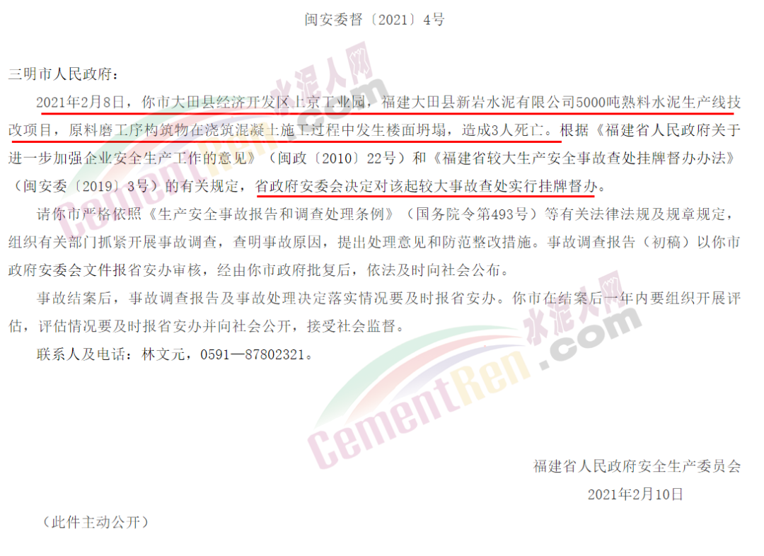 據(jù)水泥人網(wǎng)了解,福建省應(yīng)急管理廳發(fā)布較大生產(chǎn)安全事故查處掛牌督辦通知書(三明大田2.8水泥技改項目施工過程樓面坍塌事故)稱,2021年2月8日,三明市大田縣經(jīng)濟(jì)開發(fā)區(qū)上京工業(yè)園,福建大田縣新巖水泥有限公司5000噸熟料水泥生產(chǎn)線技改項目,原料磨工序構(gòu)筑物在澆筑混凝土施工過程中發(fā)生樓面坍塌,造成3人死亡。 依據(jù)有關(guān)規(guī)定,福建省政府安委會決定對該起較大事故查處實(shí)行掛牌督辦。