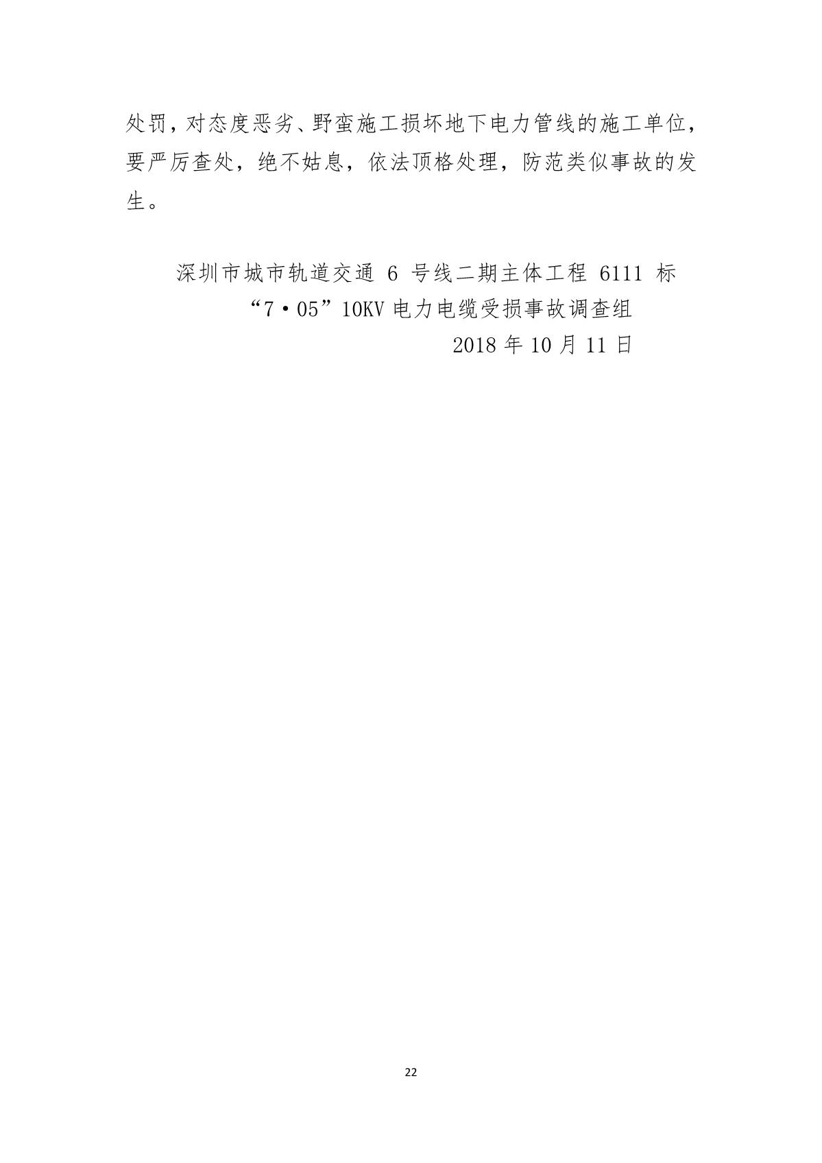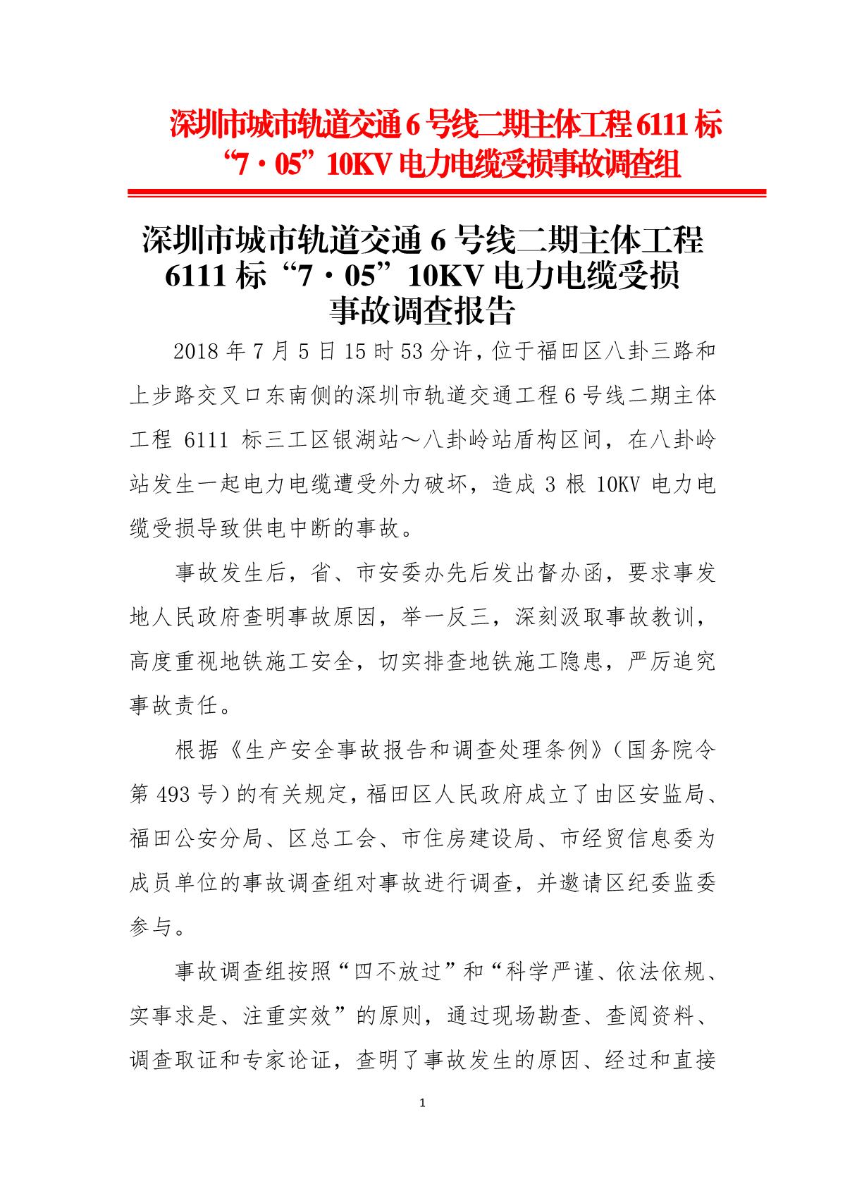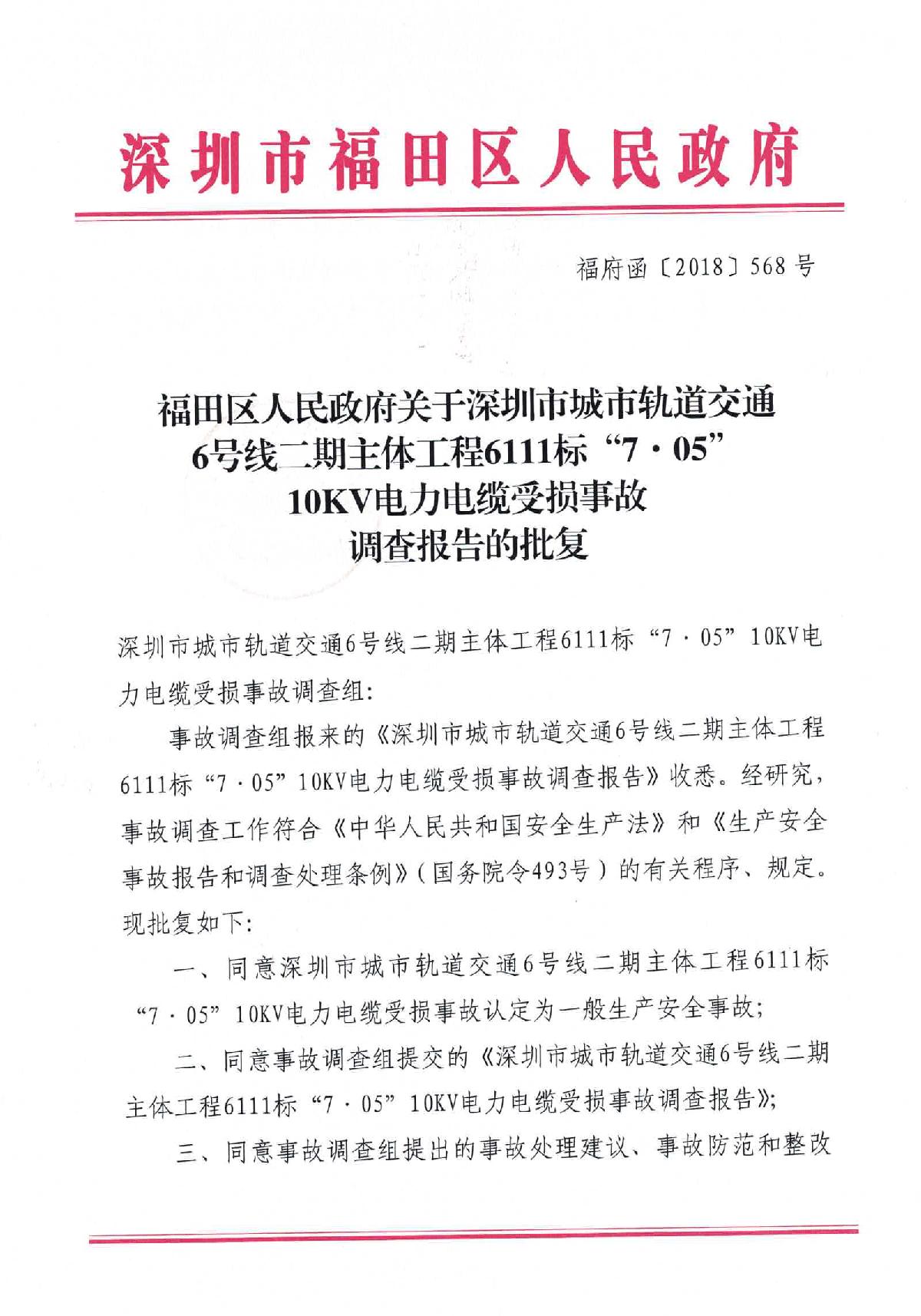 福田區(qū)人民政府關(guān)于深圳市城市軌道交通6號線二期主體工程6111標(biāo)“7.05”10kv電力電纜受損事故調(diào)查報(bào)告
