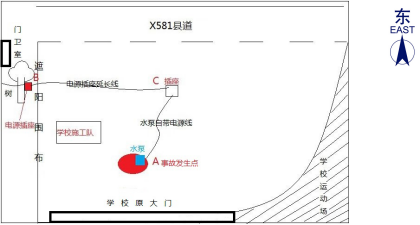 約9時(shí),馮建威先到達(dá)現(xiàn)場(chǎng)查看情況,協(xié)調(diào)借用抽水泵和處理其他維修點(diǎn)工作。隨后,薛柏林、趙文輝駕駛工程車(chē)到達(dá)耕管村附近,將一些工具和材料送給附屬施工隊(duì)【1】后,約9時(shí)20分到達(dá)該爆水管處。兩人經(jīng)商量決定先抽走水坑里的水再檢查和維修水管。薛柏林駕駛工程車(chē)向附近(約500米外)作業(yè)的附屬施工隊(duì)借回一臺(tái)潛水泵(規(guī)格為3寸220V)和一根普通電源插座延長(zhǎng)線,回來(lái)后將潛水泵放進(jìn)水坑中。趙文輝和薛柏林向?qū)W校維修項(xiàng)目工地(靠學(xué)校操場(chǎng)跑道側(cè))借用臨時(shí)用電,將連接潛水泵的電源插座延長(zhǎng)線插在工地施工用的排插上,啟動(dòng)后發(fā)現(xiàn)潛水泵不運(yùn)行,兩人徒手搖晃潛水泵并調(diào)整插頭,發(fā)現(xiàn)潛水泵仍不運(yùn)行。經(jīng)詢問(wèn)現(xiàn)場(chǎng)施工人員及剛好經(jīng)過(guò)的學(xué)校保安林建軍,得知樹(shù)下還有一處借電點(diǎn),保安林建軍未經(jīng)請(qǐng)示校領(lǐng)導(dǎo)同意擅自協(xié)助兩人將電源插座延長(zhǎng)線直接插到樹(shù)上排插上,此時(shí)潛水泵還是不運(yùn)作,趙文輝和薛柏林懷疑潛水泵可能有故障或者是有雜物堵塞。約9時(shí)45分,趙文輝走向C處查看插頭是否松動(dòng)時(shí),薛柏林則用雙手徒手檢查潛水泵故障,不慎發(fā)生觸電。此時(shí),馮建威已回來(lái)在一旁與上橫中心小學(xué)的張志老師交談,突然聽(tīng)到薛柏林發(fā)出“觸電”的叫聲,隨即跌倒在地,雙腳落入水坑中。趙文輝立馬拔掉潛水泵自帶電源線的插頭,薛柏林掙扎爬到水坑邊臉朝下趴在地上,臉色發(fā)白,處于昏迷狀態(tài)。
