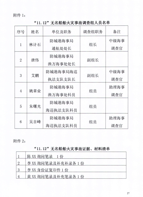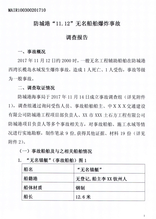 防城港“11.12“無名船舶爆炸事故調(diào)查報告