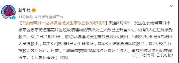 【#云南普洱一垃圾填埋場(chǎng)發(fā)生事故已致5死1傷#】截至8月3日,發(fā)生在云南省普洱市思茅區(qū)思茅街道蓮花片區(qū)垃圾填埋場(chǎng)的事故死亡人數(shù)已上升至5人,仍有1人在住院接受救治。8月1日21時(shí)30分,該垃圾填埋場(chǎng)發(fā)生事故導(dǎo)致6人被困,當(dāng)晚22時(shí)40分6名被困人員被救出,其中3人救出時(shí)已無(wú)生命體征,其余3人被緊急送醫(yī)院救治,有2人經(jīng)全力搶救無(wú)效后死亡。目前,當(dāng)?shù)厥鹿示仍笓]部稱死者死亡原因、事故經(jīng)過(guò)及原因仍在調(diào)查中。(記者何春好)極目新聞?dòng)浾呤崂戆l(fā)現(xiàn),普洱市中心城區(qū)生活垃圾焚燒發(fā)電廠建設(shè)項(xiàng)目,為思茅區(qū)2019年23項(xiàng)重點(diǎn)工作之一,于2019年啟動(dòng)建設(shè),并優(yōu)先完成填埋區(qū)建設(shè)。2020年,普洱市相關(guān)領(lǐng)導(dǎo)曾前往思茅區(qū),實(shí)地調(diào)研市中心城區(qū)生活垃圾焚燒發(fā)電廠項(xiàng)目推進(jìn)工作。公開(kāi)資料顯示,2020年3月,配套填埋場(chǎng)正式投入使用,填埋場(chǎng)類型為填埋生活垃圾的衛(wèi)生填埋場(chǎng),庫(kù)容為30.1萬(wàn)立方。