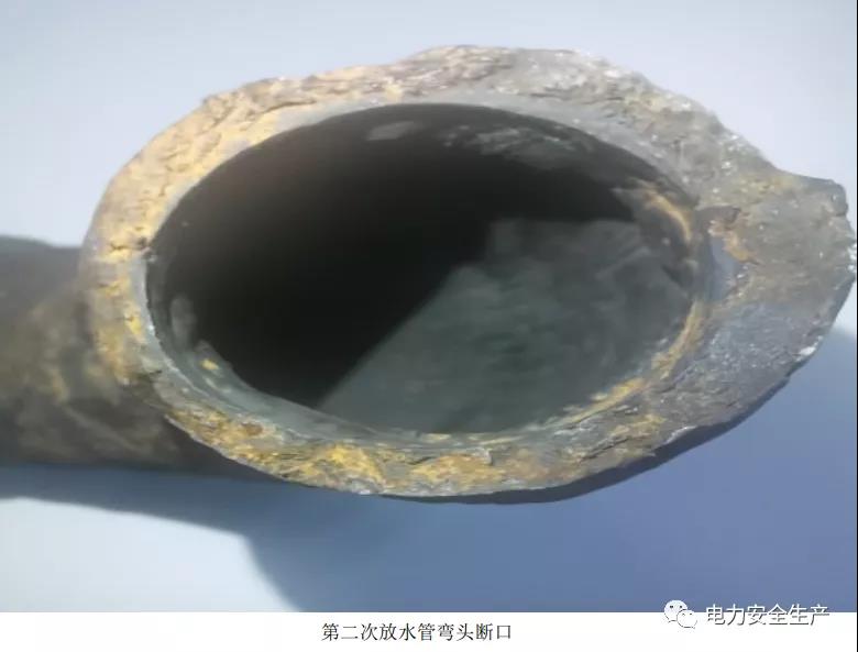 8.8 月 10 日第一次發(fā)現(xiàn)放水管泄漏,漏點為線狀裂紋,在焊口上部管座側的熱影響區(qū),距離焊口約2mm 母材處,長度約3 至 5mm。9 月 14 日帶壓堵漏過程中,在該裂紋位置發(fā)生斷裂爆開。對爆口斷面進行分析,斷面為環(huán)形,焊口無損傷,對斷裂爆口、管座、焊縫,以及相連彎頭、直管段材質光譜定性分析,材質與20G 相符(見附件 9)。分析裂紋產生原因為放水管焊口熱影響區(qū)剛性較大,彎頭與管座對接接頭的管座側熱影響區(qū)位置應力集中,產生金屬疲勞出現(xiàn)裂紋,發(fā)生泄漏。