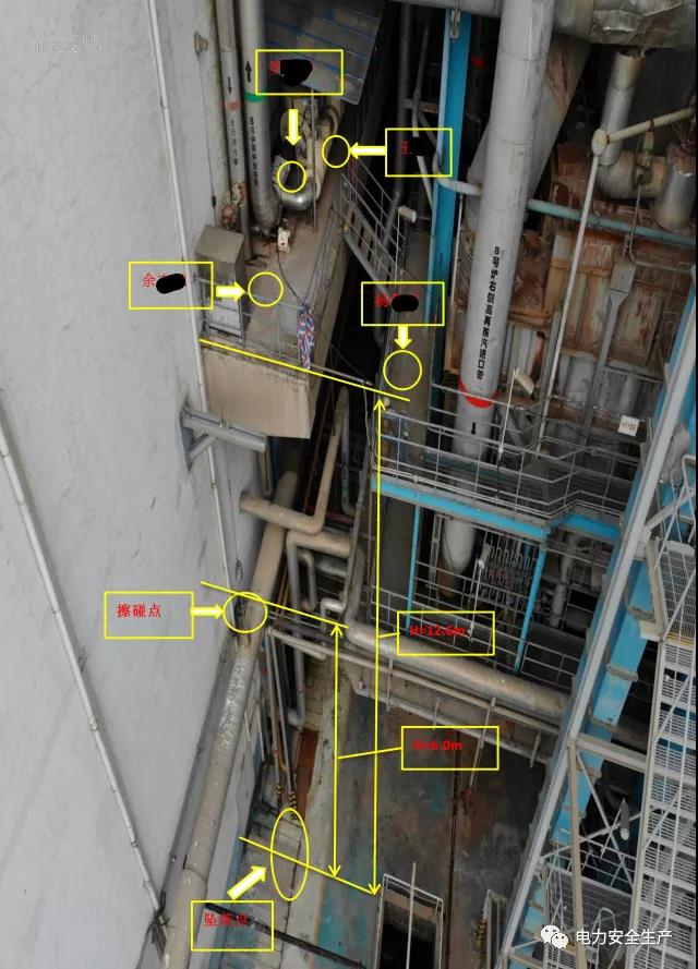 4.現(xiàn)場核查,主給水放水管已完全斷裂,下部水泥平臺被擊穿,臨近的滑動支架被高壓水汽吹脫至靠汽機房墻面,注膠槍與夾具脫開,吹至靠汽機房墻面。給水平臺頂端下部懸空冷再供熱母管保溫外護板有明顯碰撞變形痕跡,和余某某事故中躲避位置、事故后墜落位置對應。