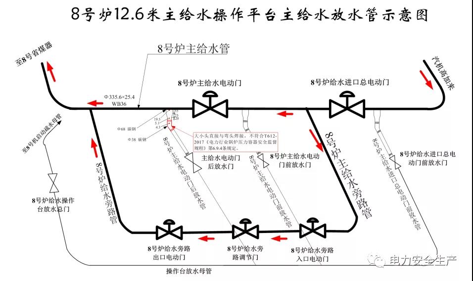 在 8 號機組鍋爐主給水管道放水管漏點處理過程中,放水管突然爆漏,高溫水汽大量噴出,導致工作現(xiàn)場3 人不同程度燙傷,其中1 人在躲避高溫水汽過程中從12.6 米作業(yè)平臺墜落至鍋爐0 米地面,經搶救無效死亡;1人送醫(yī)救治8 天后死亡。