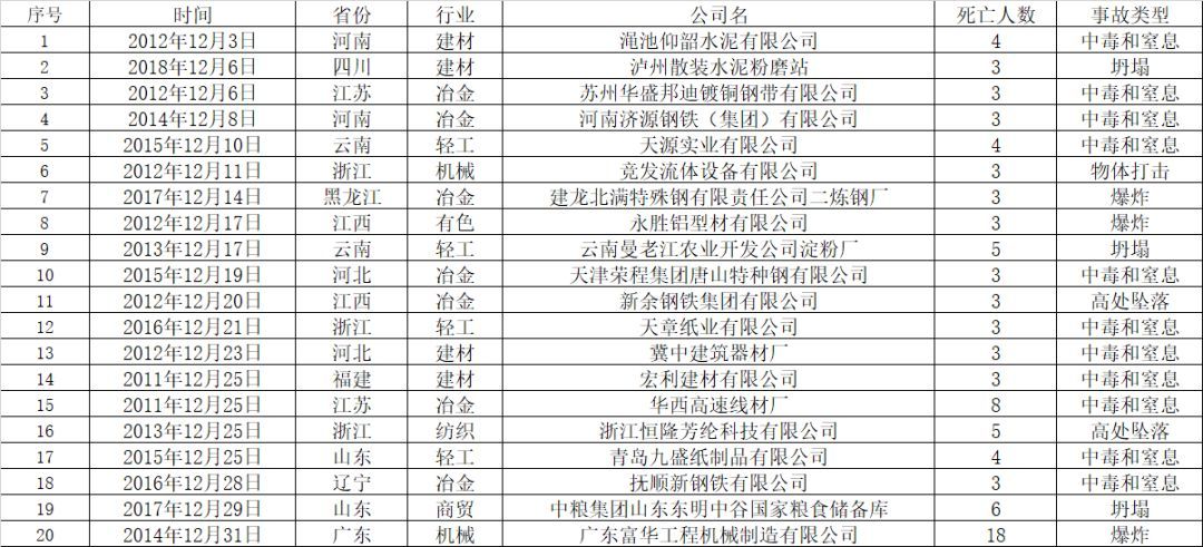 2011年至2017年的12月份,工貿(mào)行業(yè)共發(fā)生較大及以上事故20起、死亡90人,中毒和窒息事故共11起、死亡41人,事故起數(shù)和死亡人數(shù)分別占55%和45%。其中2014年12月31日,廣東富華工程機械制造有限公司發(fā)生1起因爆炸,導致死亡18人的重大事故。