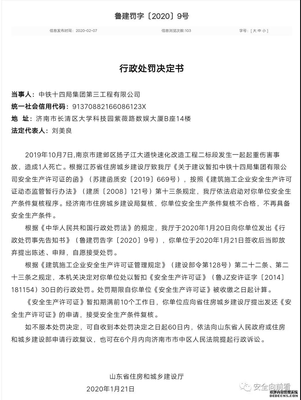 省住房城鄉(xiāng)建設(shè)廳魯建罰字〔2020〕9號行政處罰決定書顯示,2019年10月7日,南京市建鄴區(qū)揚子江大道快速化改造工程二標(biāo)段發(fā)生一起起重傷害事故,造成1人死亡。根據(jù)江蘇省住房城鄉(xiāng)建設(shè)廳致我廳《關(guān)于建議暫扣中鐵十四局集團(tuán)有限公司安全生產(chǎn)許可證的函》(蘇建函質(zhì)安〔2019〕669號),按照《建筑施工企業(yè)安全生產(chǎn)許可證動態(tài)監(jiān)管暫行辦法》(建質(zhì)〔2008〕121號)第十三條規(guī)定,我廳依法啟動對中鐵十四局三公司安全生產(chǎn)條件復(fù)核程序。