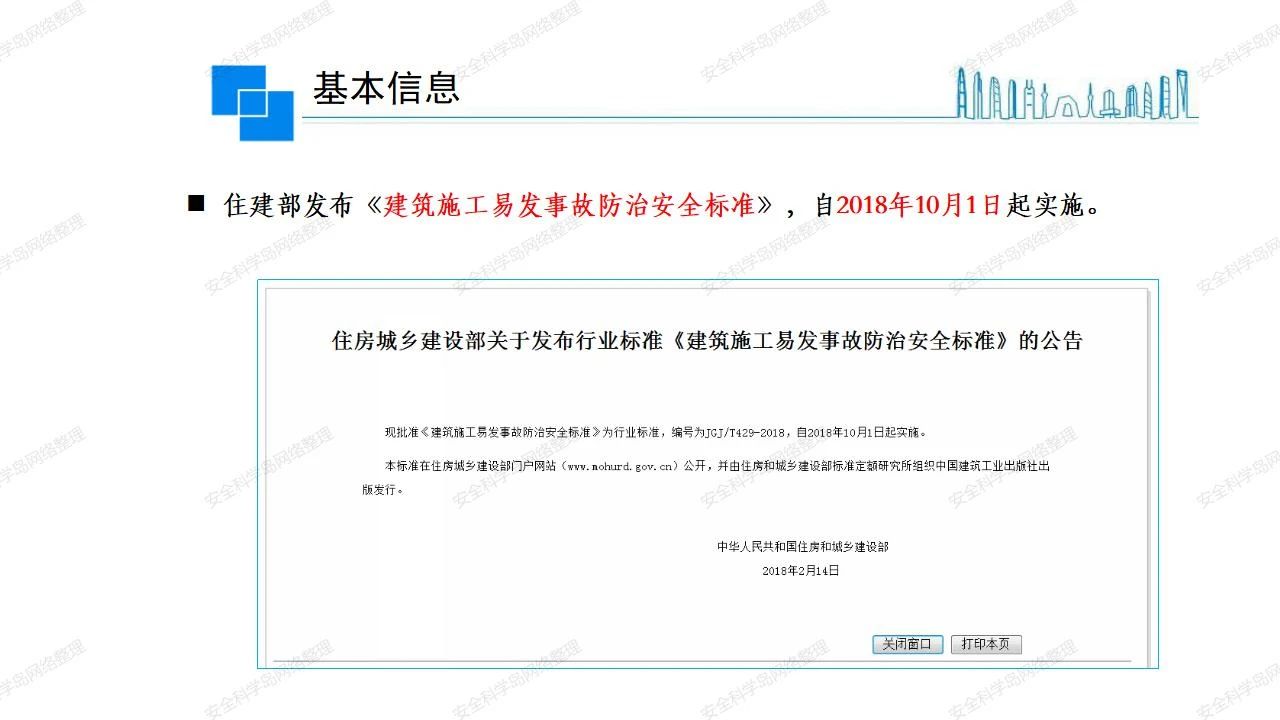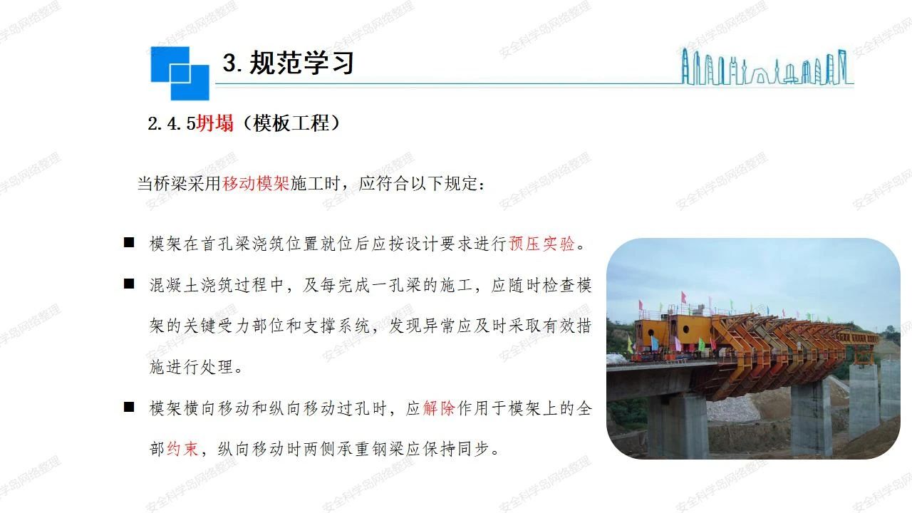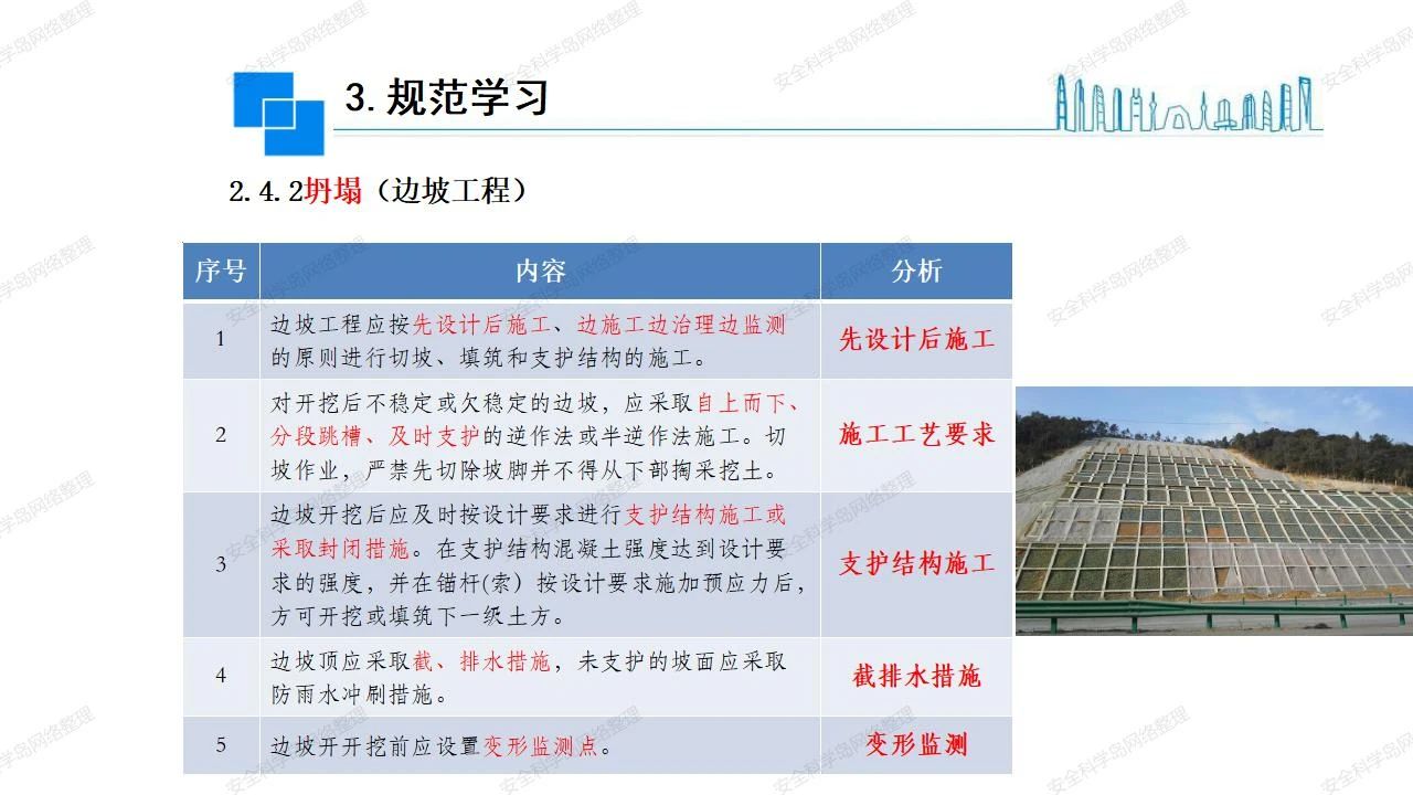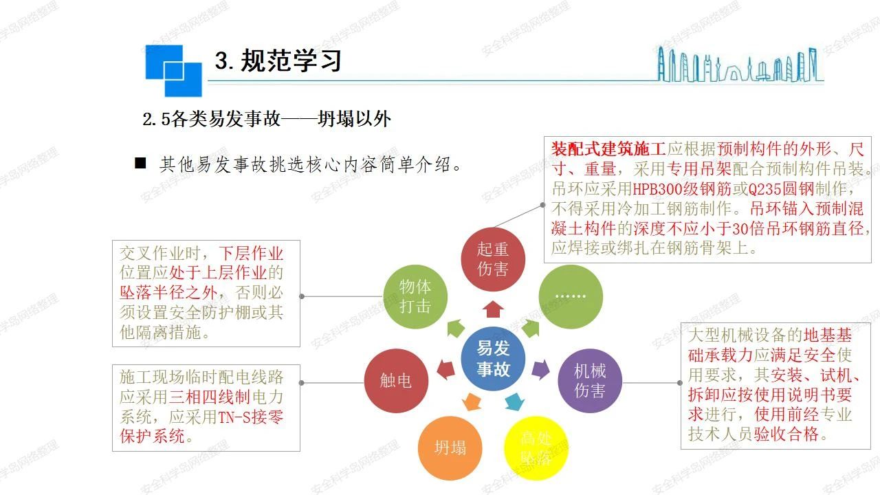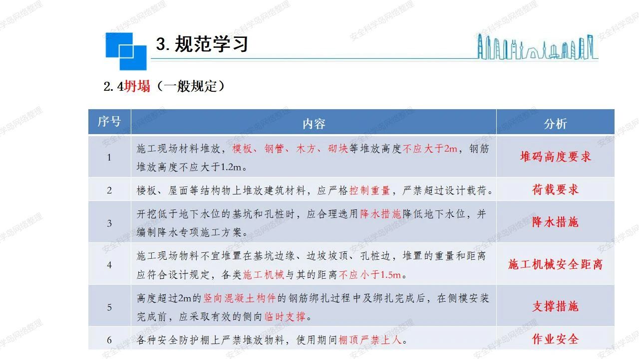 那么,坍塌事故發(fā)生的原因何在? (1)工程結(jié)構(gòu)設(shè)計不合理或計算失誤。 (2)施工前沒有編制切實可行的施工組織設(shè)計和專項施工方案,未做具體技術(shù)安全措施交底,特定施工項目未經(jīng)專家評審論證。 (3)腳手架、模板支撐、起重設(shè)備結(jié)構(gòu)設(shè)計不合理或計算失誤。 (4)建筑物結(jié)構(gòu)質(zhì)量低劣,安全性能差,地基不穩(wěn)定,不均勻沉降。 (5)建筑物結(jié)構(gòu)支撐連接(焊接)不牢固,超載、外力沖擊或嚴重偏心載荷造成失穩(wěn)等。 (6)腳手架及高大模板支架架體結(jié)構(gòu)不符合設(shè)計與規(guī)范要求,整體安全穩(wěn)定性差、超載或嚴重偏心荷載,遇外力沖擊或振動,不按程序拆除架體等因素造成失穩(wěn)等。 (7)基坑、土石方挖土?xí)r土壁不按規(guī)定留設(shè)邊坡(甚至負坡度),缺乏支護或支護不良,土質(zhì)不良或出現(xiàn)地下水、地表水的滲透,土壁經(jīng)不起重載側(cè)壓力或遇外力振動、沖擊等因素造成土壁失穩(wěn)滑坡坍塌。 (8)起重設(shè)備技術(shù)安全性能差,結(jié)構(gòu)強度不夠,安全防護裝置不完善,垂直起重機與建筑物拉結(jié)差,出現(xiàn)超載、碰撞、升降過度或違章操作等原因,造成起重設(shè)備倒塌。 (9)現(xiàn)場作業(yè)環(huán)境不良,安全防護設(shè)施缺乏。 (10)施工現(xiàn)場管理松弛,各項質(zhì)量、安全管理制度流于形式。 (11)片面追求經(jīng)濟利益,偷工減料,施工質(zhì)量差。 (12)施工隊伍素質(zhì)差,不執(zhí)行法規(guī)、標(biāo)準,違章指揮、違章作業(yè),思想上存在盲目性、冒險性、隨意性。 如何預(yù)防坍塌事故? (1)根據(jù)設(shè)計與規(guī)范要求,認真編制施工組織設(shè)計和專項施工技術(shù)方案、應(yīng)急預(yù)案,做好特定施工項目專家評審論證及技術(shù)安全交底工作。 (2)支架、腳手架等搭設(shè)完成后應(yīng)組織相關(guān)部門驗收。支架還應(yīng)按方案要求進行堆載預(yù)壓。 (3)嚴格控制模板支架、腳手架等承受的荷載,模板、腳手架及其支撐體系的施工荷載應(yīng)做到均勻分布,并不得超過設(shè)計要求。嚴禁超載、對構(gòu)筑物進行外力沖擊或偏心載荷。 (4)基坑、土石方挖土?xí)r土壁按規(guī)定留設(shè)邊坡,嚴格按照設(shè)計坡度進行放坡開挖,進行有效支護和排水,并設(shè)置專人對邊坡穩(wěn)定性進行檢測?;討?yīng)基坑頂邊緣1m范圍內(nèi)禁止堆放材料。 (5)加強起重設(shè)備的采購管理,嚴禁使用不合格的起重設(shè)備,并定期進行檢測,確保各項性能和安全防護裝置良好;加強起重設(shè)備的安裝、拆除管理;加強起重設(shè)備的使用管理,嚴禁超載、碰撞或違章操作;加強對起重設(shè)備操作人員、指揮人員、安拆人員的安全教育培訓(xùn),考核合格后持證上崗。 (6)加強施工現(xiàn)場管理,設(shè)置有效安全防護設(shè)施。 (7)加強對從業(yè)人員的培訓(xùn)教育,提高隊伍素質(zhì),強化質(zhì)量、安全意識。 (8)強化工程質(zhì)量報驗和檢驗、簽證制度,不經(jīng)檢驗合格,不準進行下道工序施工。 (9)發(fā)現(xiàn)坍塌事故的險情,要認真分析原因,積極研究提出排除隱患的整改措施,并監(jiān)督執(zhí)行。