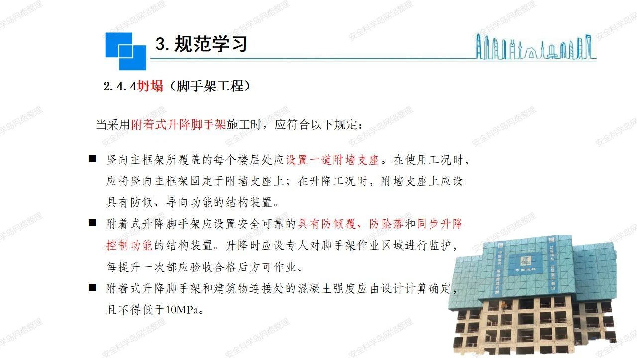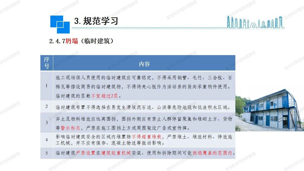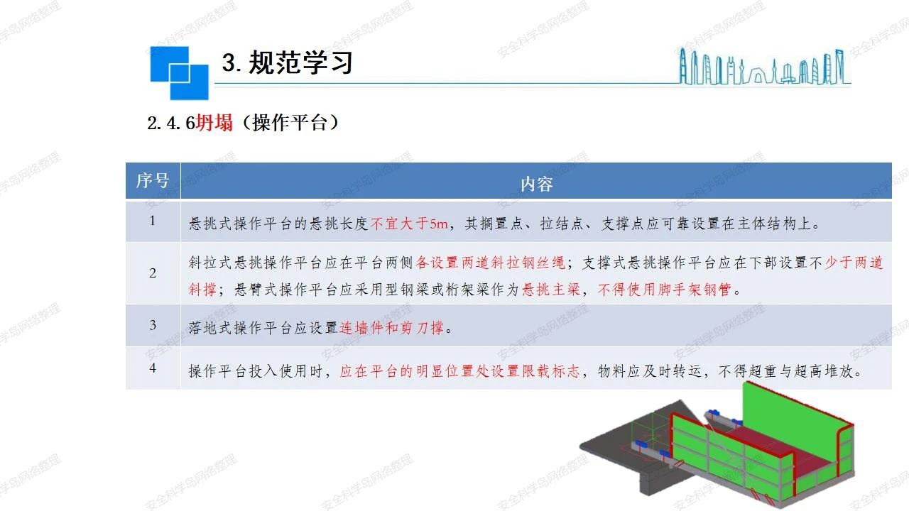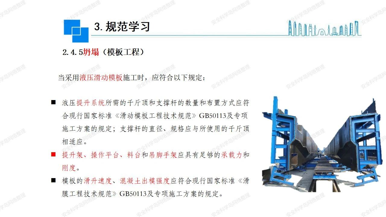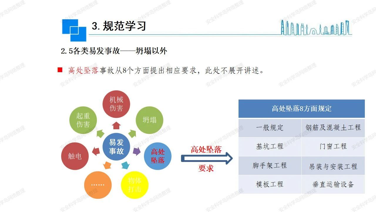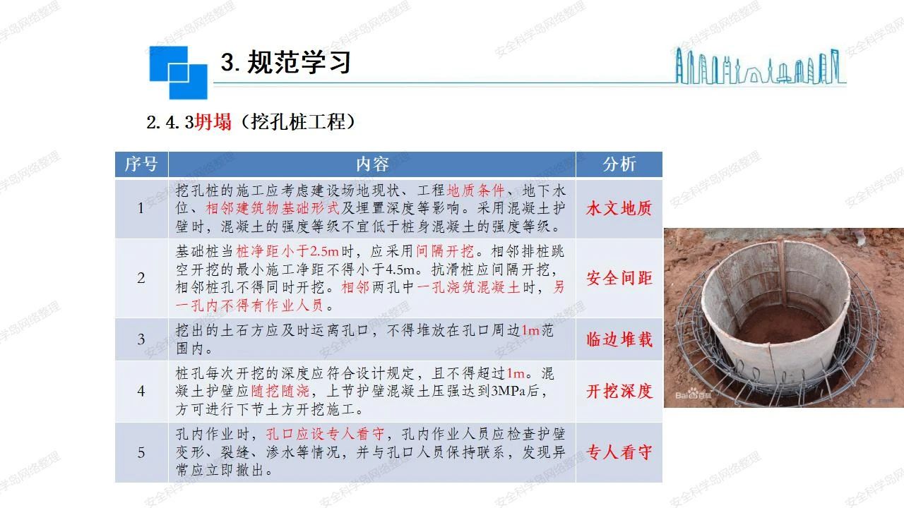 那么,坍塌事故發(fā)生的原因何在? (1)工程結(jié)構(gòu)設(shè)計不合理或計算失誤。 (2)施工前沒有編制切實可行的施工組織設(shè)計和專項施工方案,未做具體技術(shù)安全措施交底,特定施工項目未經(jīng)專家評審論證。 (3)腳手架、模板支撐、起重設(shè)備結(jié)構(gòu)設(shè)計不合理或計算失誤。 (4)建筑物結(jié)構(gòu)質(zhì)量低劣,安全性能差,地基不穩(wěn)定,不均勻沉降。 (5)建筑物結(jié)構(gòu)支撐連接(焊接)不牢固,超載、外力沖擊或嚴重偏心載荷造成失穩(wěn)等。 (6)腳手架及高大模板支架架體結(jié)構(gòu)不符合設(shè)計與規(guī)范要求,整體安全穩(wěn)定性差、超載或嚴重偏心荷載,遇外力沖擊或振動,不按程序拆除架體等因素造成失穩(wěn)等。 (7)基坑、土石方挖土?xí)r土壁不按規(guī)定留設(shè)邊坡(甚至負坡度),缺乏支護或支護不良,土質(zhì)不良或出現(xiàn)地下水、地表水的滲透,土壁經(jīng)不起重載側(cè)壓力或遇外力振動、沖擊等因素造成土壁失穩(wěn)滑坡坍塌。 (8)起重設(shè)備技術(shù)安全性能差,結(jié)構(gòu)強度不夠,安全防護裝置不完善,垂直起重機與建筑物拉結(jié)差,出現(xiàn)超載、碰撞、升降過度或違章操作等原因,造成起重設(shè)備倒塌。 (9)現(xiàn)場作業(yè)環(huán)境不良,安全防護設(shè)施缺乏。 (10)施工現(xiàn)場管理松弛,各項質(zhì)量、安全管理制度流于形式。 (11)片面追求經(jīng)濟利益,偷工減料,施工質(zhì)量差。 (12)施工隊伍素質(zhì)差,不執(zhí)行法規(guī)、標(biāo)準,違章指揮、違章作業(yè),思想上存在盲目性、冒險性、隨意性。 如何預(yù)防坍塌事故? (1)根據(jù)設(shè)計與規(guī)范要求,認真編制施工組織設(shè)計和專項施工技術(shù)方案、應(yīng)急預(yù)案,做好特定施工項目專家評審論證及技術(shù)安全交底工作。 (2)支架、腳手架等搭設(shè)完成后應(yīng)組織相關(guān)部門驗收。支架還應(yīng)按方案要求進行堆載預(yù)壓。 (3)嚴格控制模板支架、腳手架等承受的荷載,模板、腳手架及其支撐體系的施工荷載應(yīng)做到均勻分布,并不得超過設(shè)計要求。嚴禁超載、對構(gòu)筑物進行外力沖擊或偏心載荷。 (4)基坑、土石方挖土?xí)r土壁按規(guī)定留設(shè)邊坡,嚴格按照設(shè)計坡度進行放坡開挖,進行有效支護和排水,并設(shè)置專人對邊坡穩(wěn)定性進行檢測?;討?yīng)基坑頂邊緣1m范圍內(nèi)禁止堆放材料。 (5)加強起重設(shè)備的采購管理,嚴禁使用不合格的起重設(shè)備,并定期進行檢測,確保各項性能和安全防護裝置良好;加強起重設(shè)備的安裝、拆除管理;加強起重設(shè)備的使用管理,嚴禁超載、碰撞或違章操作;加強對起重設(shè)備操作人員、指揮人員、安拆人員的安全教育培訓(xùn),考核合格后持證上崗。 (6)加強施工現(xiàn)場管理,設(shè)置有效安全防護設(shè)施。 (7)加強對從業(yè)人員的培訓(xùn)教育,提高隊伍素質(zhì),強化質(zhì)量、安全意識。 (8)強化工程質(zhì)量報驗和檢驗、簽證制度,不經(jīng)檢驗合格,不準進行下道工序施工。 (9)發(fā)現(xiàn)坍塌事故的險情,要認真分析原因,積極研究提出排除隱患的整改措施,并監(jiān)督執(zhí)行。