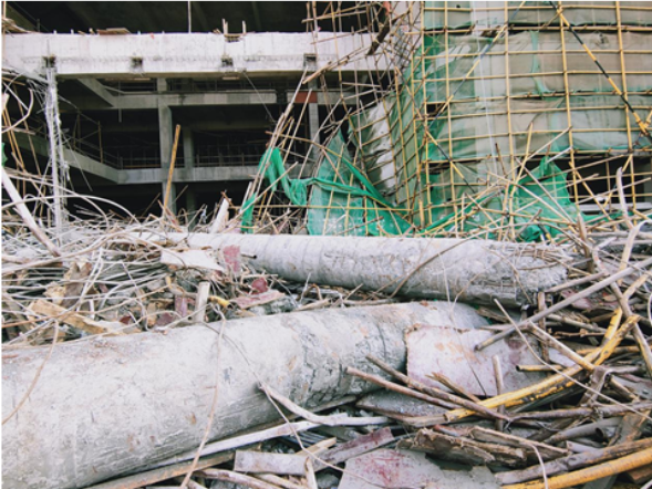 1、違規(guī)直接利用外腳手架作為模板支撐體系,且該支撐體系未增設(shè)加固立桿,也沒(méi)有與已經(jīng)完成施工的建筑結(jié)構(gòu)形成有效的拉結(jié);