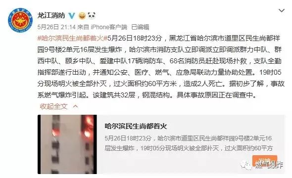 據(jù)@龍江消防:#哈爾濱民生尚都著火#5月26日18時(shí)23分,黑龍江省哈爾濱市道里區(qū)民生尚都祥園9號(hào)樓2單元16層發(fā)生爆炸,哈爾濱市消防支隊(duì)立即調(diào)派立即調(diào)派群力中隊(duì)、群西中隊(duì)、顧?quán)l(xiāng)中隊(duì)、愛建中隊(duì)17輛消防車、68名消防員趕赴現(xiàn)場(chǎng)撲救,支隊(duì)全勤指揮部遂行出動(dòng),并通知公安、醫(yī)療、燃?xì)?、?yīng)急局聯(lián)動(dòng)力量協(xié)助處置。19時(shí)05分現(xiàn)場(chǎng)明火被全部撲滅,過(guò)火面積約60平方米,造成2人死亡。據(jù)初步了解,事故系燃?xì)獗ㄒ?。該建筑?2層,鋼混結(jié)構(gòu)。