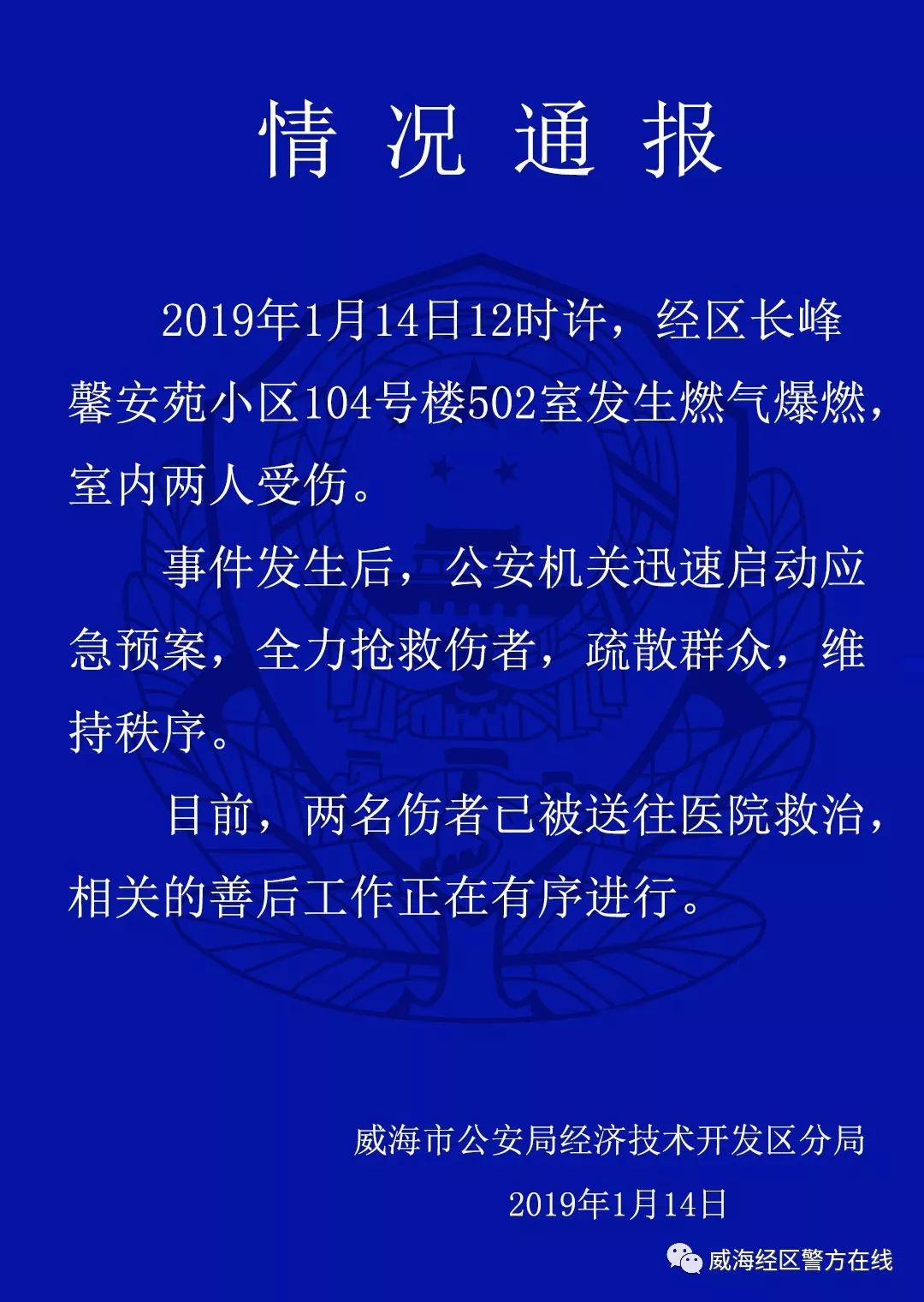 今天下午,威海市公安局經(jīng)濟技術(shù)開發(fā)區(qū)分局發(fā)布通報:今天中午12時許,經(jīng)區(qū)長峰馨安苑小區(qū)104號樓502室發(fā)生燃氣爆燃,室內(nèi)兩人受傷。