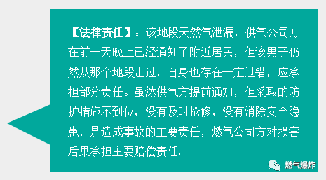 某男在早上散步過程中,地下天然氣爆炸造成死亡。頭一天晚上11點(diǎn)就知道該區(qū)域有天然氣泄漏,燃?xì)夤疽呀?jīng)提前通知了附近居民。