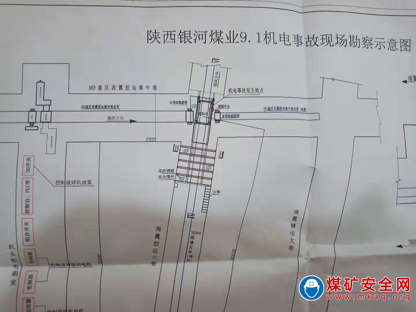 現(xiàn)場勘查認(rèn)定,事故發(fā)生在該礦井下303西翼膠運(yùn)大巷皮帶機(jī)頭與南翼大巷皮帶機(jī)尾處MMD625加長型破碎機(jī)箱體內(nèi)。