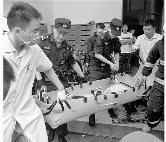 情況危急,消防隊員與PTU隊員合力將受傷男子抬上擔架,由120急救車送往醫(yī)院救治。