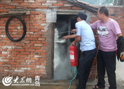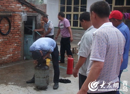 7月25日13時,黃島公安分局理務關(guān)派出所接到群眾報警,村民曲大娘在廚房給老伴煮綠豆湯時煤氣罐突然起火。接警后,理務關(guān)派出所民警立即趕到現(xiàn)場,發(fā)現(xiàn)煤氣罐在西屋廚房內(nèi),煤氣罐軟管接口脫落,接口處正在噴火,并且已經(jīng)引燃了附近的桌子,十分危險。民警迅速靠近火勢區(qū)域,頂著濃煙先將煤氣閥關(guān)閉,然后和附近群眾一起利用滅火器對廚房內(nèi)可燃物進行噴灑,并用打濕的衣物蓋在液化氣罐上對罐體進行冷卻,成功化解了險情。此時,曲大娘懸著的心也放了下來。