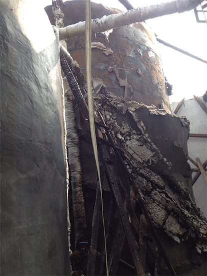現(xiàn)場勘察發(fā)現(xiàn),3號罐輸送至1號罐的輸送管水平距離為10米,并用保溫材料進(jìn)行保溫。爆炸現(xiàn)場1號罐固定頂被炸飛,另兩只儲罐完好。爆炸的1號罐罐頂材質(zhì)為厚度5mm的鐵板,自制而成。內(nèi)壁較為粗糙,進(jìn)料口附近約50cm的范圍內(nèi)有熏黑的痕跡,未煙熏部分有鐵銹。罐頂設(shè)有人孔蓋和放空口,在人孔蓋附近無保溫材料,外壁有明顯燃燒的痕跡,人孔蓋與罐頂原有焊接縫處的焊接片脫落,說明罐頂外壁燃燒有一段時(shí)間。被結(jié)晶萘堵塞點(diǎn)位于1號罐罐頂進(jìn)料口水平距離約40cm,垂直距離約40cm,堵塞點(diǎn)與進(jìn)料口連接的法蘭已拆除;現(xiàn)場留有氣割槍等工具。