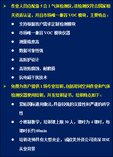 方案一 | (1)泵吸式5合1氣體檢測(cè)儀 (2)《授權(quán)氣體檢測(cè)員培訓(xùn)》+《密閉空間作業(yè)安全培訓(xùn)》 (3)贈(zèng)送2名工人的“密閉空間作業(yè)安心包”產(chǎn)品。 |